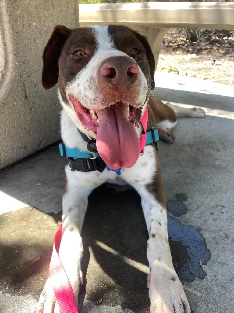 We went to San Miguel Park and I let Ruby guide us along whichever trails she liked for a good hour. She’s very polite on a leash and was fine passing other people on the trails. We did see a few dogs as well, and while she was alert when she noticed them, she didn’t bark or lunge. The only time she got noticeably excited was when a man passed by on a bike with his dogs running next to him, but it seemed like a playful reaction to me. She does seem to have a prey drive. I had to pull her back a few times when we heard/ saw a critter just off trail, but she didn’t get carried away.